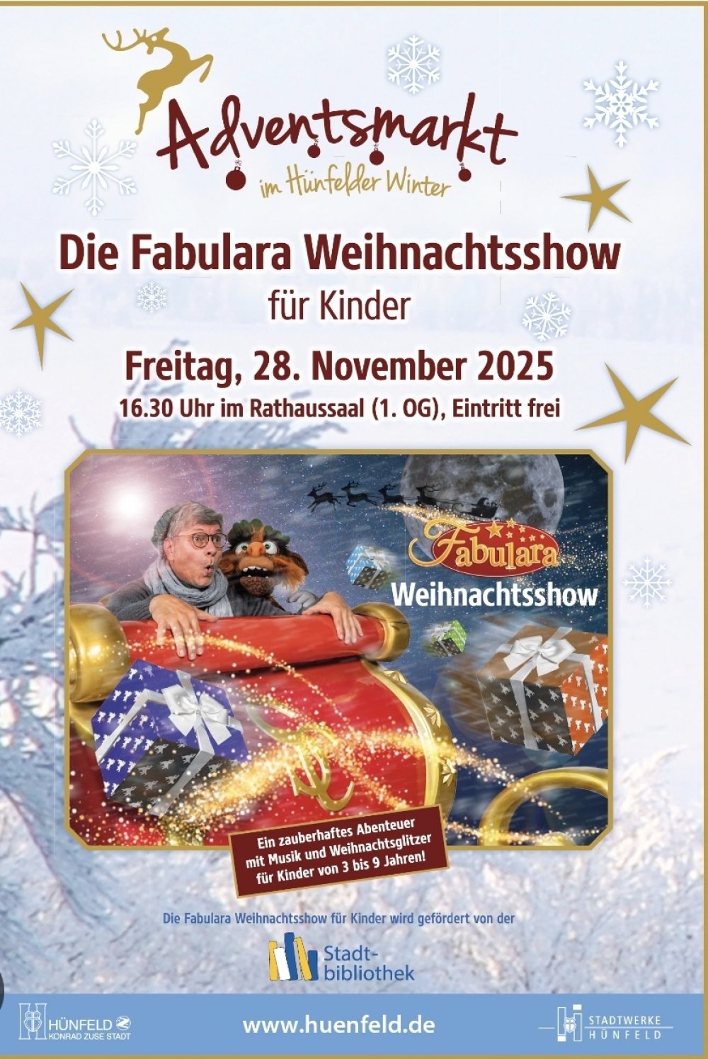 Was für ein schöner (aber auch langer) Tag!🎄🤩🫶🏻🤓✨️📚Auf dem Hünfelder Adventsmarkt haben wir gemeinsam mit den Kindern und ihren Eltern eine schöne Fabulara Weihnachtsshow erleben dürfen.🎉📚🎄Wir haben das Rathaus in ein Winter-Wunderland verzaubert. ⛄️