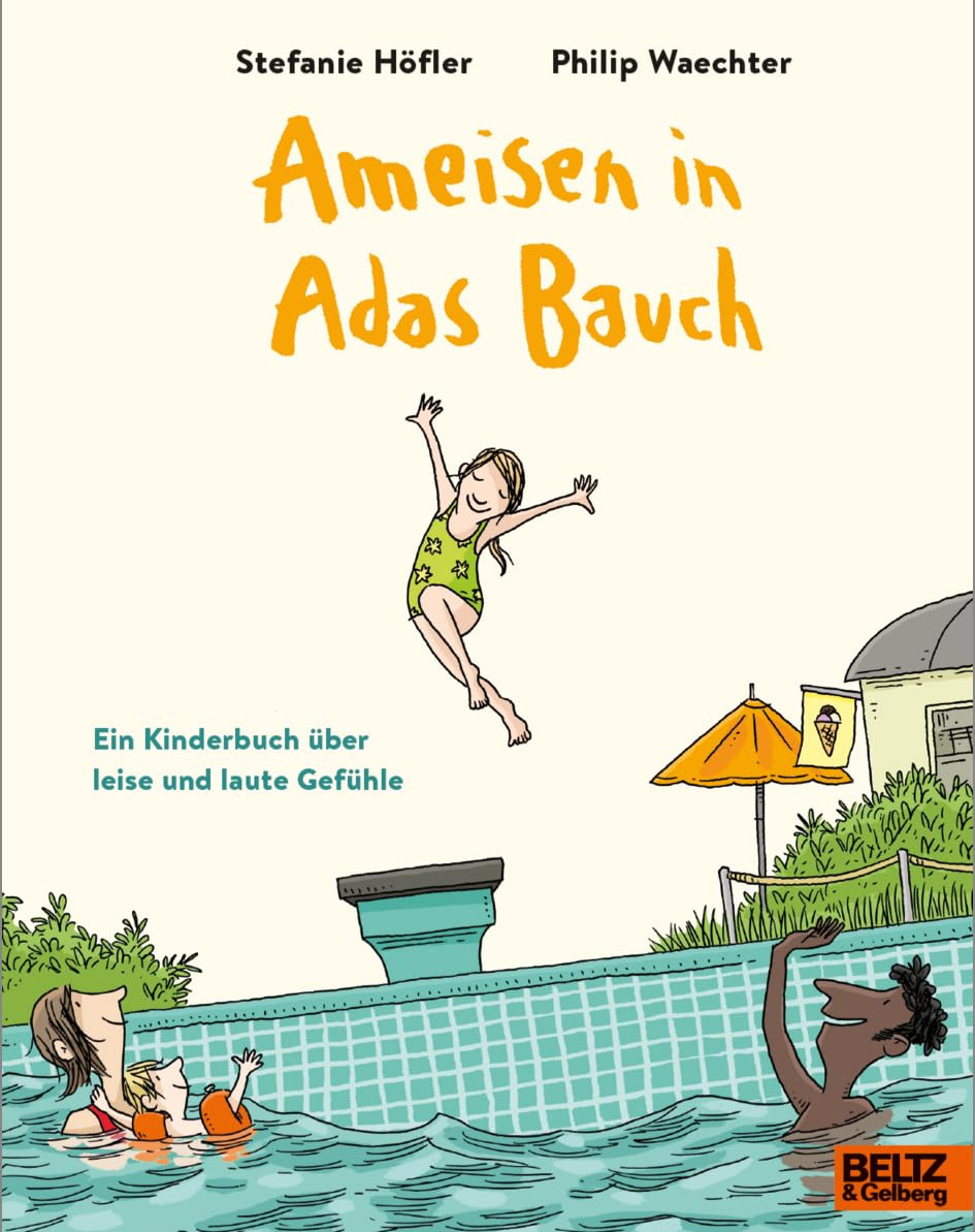 Stefanie Höfler ist eine Autorin, die die Gefühlswelt von Kindern sehr einfühlsam darstellen kann. Vielleicht kennen manche ihre Bücher „Der Tanz der Tiefseequalle", „Mein Sommer mit Mucks", „Helsin Apelsin" oder „Feuerwanzen lügen nicht". Immer ist sie ganz nah bei den Kindern, deren Sorgen sie beschreibt. Diesmal hat sie ein Kinderbuch für jüngere Kinder geschrieben, ein Buch über Adas Gefühlsleben. Das sind nicht nur Sorgen, nein, ganz viele Glücksgefühle sind dabei. In kurzen Episoden begleiten wir die 6-jährige Ada durch die Sommerferien, bevor sie in die Schule kommt. Immer mit dabei sind ihr Bruder Max, Mama, Paul (ein Freund der Familie), Adas Freundin Laila und alle lauten und leisen Gefühle, die ein Leben ausmachen: Sorge, Schadenfreude, Glückseligkeit, Neugierde, Traurigkeit, Eifersucht, Jubel, Hass, schlechtes Gewissen, Schokokuchengefühle, Mut, Kribbeln im Bauch und Angst. Stefanie Höfler kann das toll in Worte fassen: „Manchmal stecken Worte ganz weit unten im Bauch. Ziemlich viele Worte sind das, und zusammen ergeben sie einen kratzigen Berg aus Kurven und Zacken und Kanten, der sich nicht in Adas Mund traut." Und dann gibt es auch einfach Fragen, die Ada sich so stellt: Können Hühner weinen? Wieso finden alle Lippenstift bei Frauen schön und bei Männern komisch? Hat eine Kuh Angst vorm Melken oder macht ihr das Spaß?